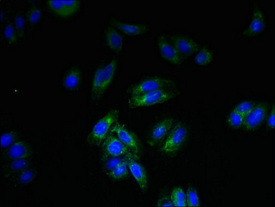 • Immunofluorescent analysis of HepG2 cells using CSB-PA865142LA01HU at dilution of 1:100 and Alexa Fluor 488-congugated AffiniPure Goat Anti-Rabbit IgG(H+L)
