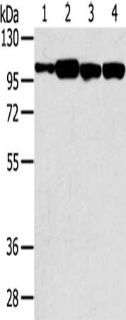 • Gel: 6%SDS-PAGE, Lysate: 40 μg, Lane 1-4: Hepg2 cells, TM4 cells, 293T cells, NIH/3T3 cells, Primary antibody: CSB-PA948154(SRGAP1 Antibody) at dilution 1/200, Secondary antibody: Goat anti rabbit IgG at 1/8000 dilution, Exposure time: 20 seconds