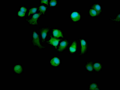 Immunofluorescence staining of MCF-7 cells with CSB-PA896714LA01HU at 1:200, counter-stained with DAPI. The cells were fixed in 4% formaldehyde, permeabilized using 0.2% Triton X-100 and blocked in 10% normal Goat Serum. The cells were then incubated with the antibody overnight at 4°C. The secondary antibody was Alexa Fluor 488-congugated AffiniPure Goat Anti-Rabbit IgG(H+L).