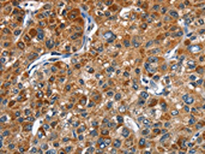The image on the left is immunohistochemistry of paraffin-embedded Human liver cancer tissue using CSB-PA033399(STK17B Antibody) at dilution 1/40, on the right is treated with fusion protein. (Original magnification: ×200)