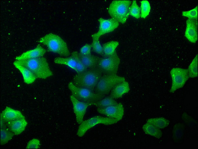 Immunofluorescence staining of HepG2 cells with CSB-PA621644NA01HU at 1:168, counter-stained with DAPI. The cells were fixed in 4% formaldehyde, permeabilized using 0.2% Triton X-100 and blocked in 10% normal Goat Serum. The cells were then incubated with the antibody overnight at 4°C. The secondary antibody was Alexa Fluor 488-congugated AffiniPure Goat Anti-Rabbit IgG(H+L).
