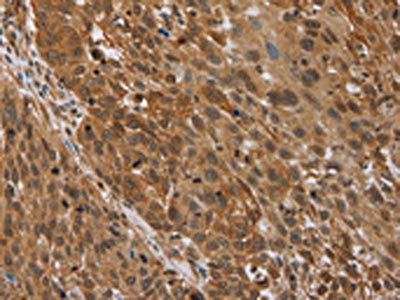 The image on the left is immunohistochemistry of paraffin-embedded Human lung cancer tissue using CSB-PA024314(STMN2/STMN3/STMN4 Antibody) at dilution 1/45, on the right is treated with synthetic peptide. (Original magnification: ×200)