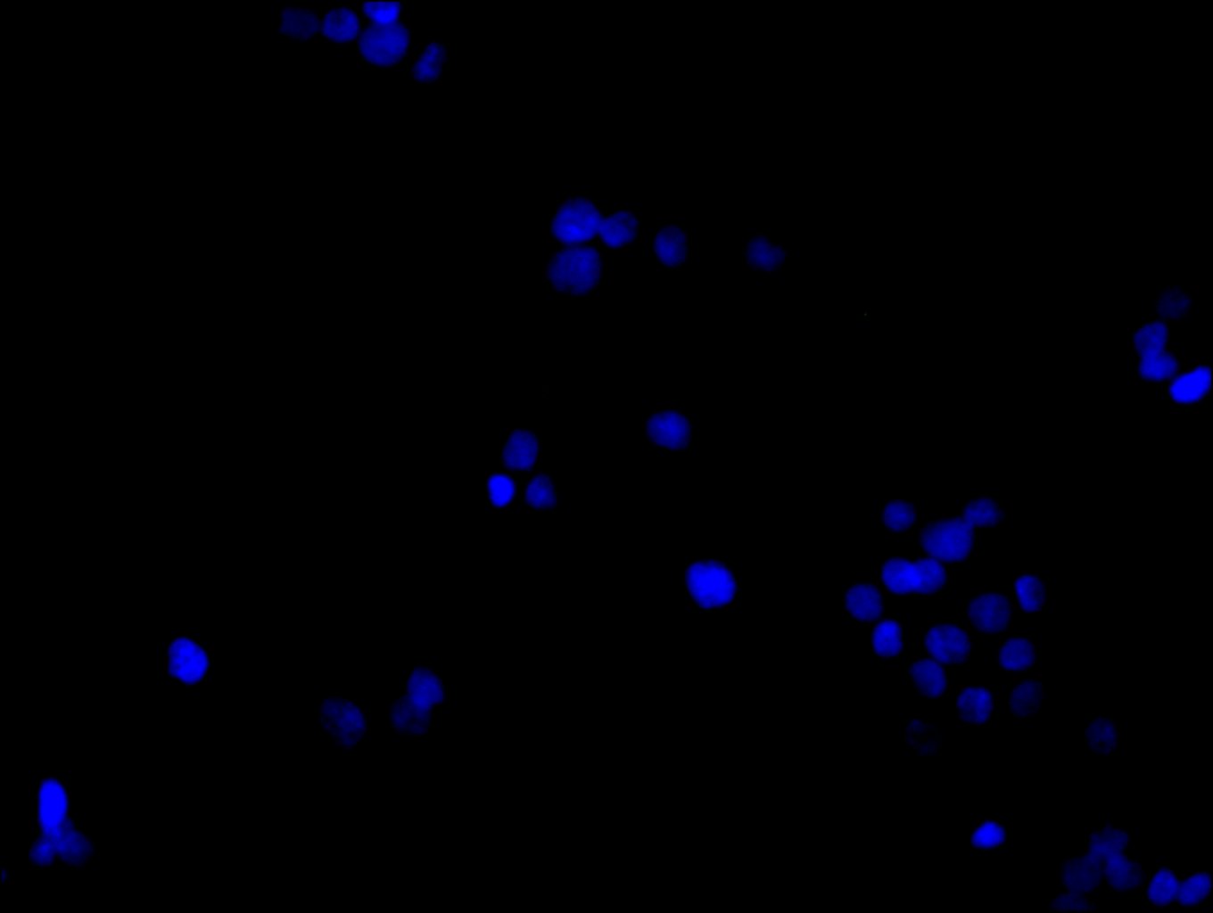 Immunofluorescence staining of COLO320 cell with CSB-PA866301LA01HU at 1:20, counter-stained with DAPI. The cells were fixed in 4% formaldehyde and blocked in 10% normal Goat Serum. The cells were then incubated with the antibody overnight at 4C. The secondary antibody was Alexa Fluor 488-congugated AffiniPure Goat Anti-Rabbit IgG(H+L).