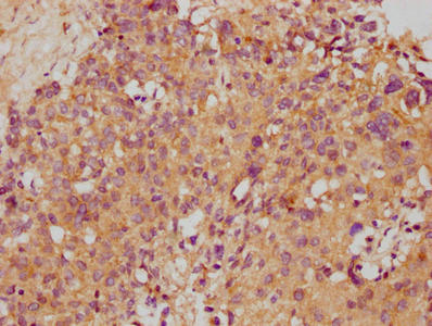 IHC image of CSB-PA022888LA01HU diluted at 1:500 and staining in paraffin-embedded human ovarian cancer performed on a Leica BondTM system. After dewaxing and hydration, antigen retrieval was mediated by high pressure in a citrate buffer (pH 6.0). Section was blocked with 10% normal goat serum 30min at RT. Then primary antibody (1% BSA) was incubated at 4°C overnight. The primary is detected by a biotinylated secondary antibody and visualized using an HRP conjugated SP system.