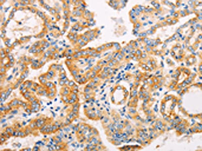 The image on the left is immunohistochemistry of paraffin-embedded Human thyroid cancer tissue using CSB-PA954231(SUFU Antibody) at dilution 1/10, on the right is treated with fusion protein. (Original magnification: ×200)