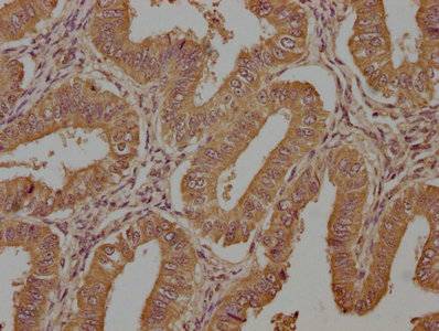 IHC image of CSB-PA023062LA01HU diluted at 1:1500 and staining in paraffin-embedded human endometrial cancer performed on a Leica BondTM system. After dewaxing and hydration, antigen retrieval was mediated by high pressure in a citrate buffer (pH 6.0). Section was blocked with 10% normal goat serum 30min at RT. Then primary antibody (1% BSA) was incubated at 4°C overnight. The primary is detected by a biotinylated secondary antibody and visualized using an HRP conjugated SP system.