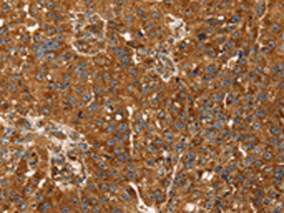 The image on the left is immunohistochemistry of paraffin-embedded Human liver cancer tissue using CSB-PA082079(TBC1D1 Antibody) at dilution 1/45, on the right is treated with synthetic peptide. (Original magnification: ×200)