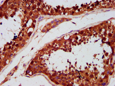 IHC image of CSB-PA803114LA01HU diluted at 1:500 and staining in paraffin-embedded human testis tissue performed on a Leica BondTM system. After dewaxing and hydration, antigen retrieval was mediated by high pressure in a citrate buffer (pH 6.0). Section was blocked with 10% normal goat serum 30min at RT. Then primary antibody (1% BSA) was incubated at 4°C overnight. The primary is detected by a biotinylated secondary antibody and visualized using an HRP conjugated SP system.