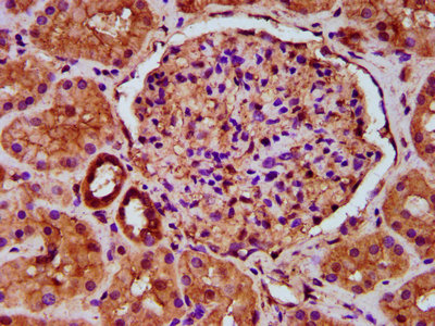 IHC image of CSB-PA803114LA01HU diluted at 1:500 and staining in paraffin-embedded human kidney tissue performed on a Leica BondTM system. After dewaxing and hydration, antigen retrieval was mediated by high pressure in a citrate buffer (pH 6.0). Section was blocked with 10% normal goat serum 30min at RT. Then primary antibody (1% BSA) was incubated at 4°C overnight. The primary is detected by a biotinylated secondary antibody and visualized using an HRP conjugated SP system.