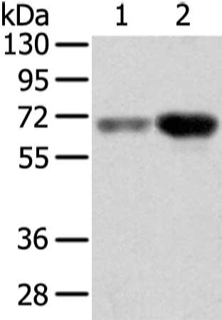 Gel: 8%SDS-PAGE, Lysate: 40 μg, Lane 1-2: Human lung cancer and placenta tissue, Primary antibody: CSB-PA441798(TBL1X Antibody) at dilution 1/500 dilution, Secondary antibody: Goat anti rabbit IgG at 1/8000 dilution, Exposure time: 5 seconds