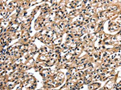 • The image on the left is immunohistochemistry of paraffin-embedded Human prostate cancer tissue using CSB-PA199259(TBX10 Antibody) at dilution 1/35, on the right is treated with fusion protein. (Original magnification: ×200)