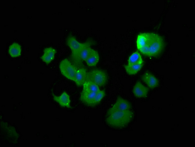 Immunofluorescence staining of MCF-7 cells with CSB-PA874804LA01HU at 1:400, counter-stained with DAPI. The cells were fixed in 4% formaldehyde, permeabilized using 0.2% Triton X-100 and blocked in 10% normal Goat Serum. The cells were then incubated with the antibody overnight at 4°C. The secondary antibody was Alexa Fluor 488-congugated AffiniPure Goat Anti-Rabbit IgG(H+L).