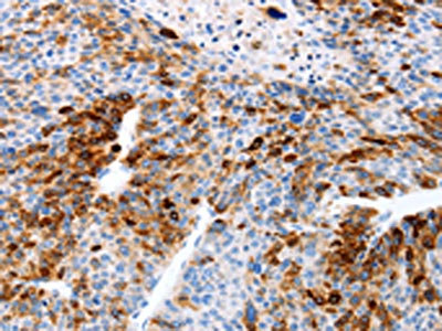 The image on the left is immunohistochemistry of paraffin-embedded Human cervical cancer tissue using CSB-PA160693(TFF1 Antibody) at dilution 1/20, on the right is treated with fusion protein. (Original magnification: ×200)