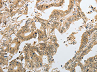 The image on the left is immunohistochemistry of paraffin-embedded Human gastric cancer tissue using CSB-PA060587(TGFB1 Antibody) at dilution 1/20, on the right is treated with fusion protein. (Original magnification: ×200)