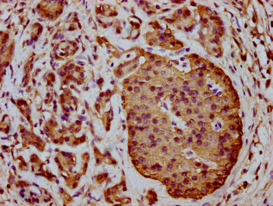 IHC image of CSB-PA735984LA01HU diluted at 1:400 and staining in paraffin-embedded human pancreatic cancer performed on a Leica BondTM system. After dewaxing and hydration, antigen retrieval was mediated by high pressure in a citrate buffer (pH 6.0). Section was blocked with 10% normal goat serum 30min at RT. Then primary antibody (1% BSA) was incubated at 4°C overnight. The primary is detected by a biotinylated secondary antibody and visualized using an HRP conjugated SP system.
