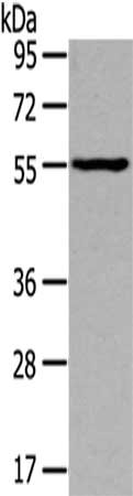 • Gel: 8%SDS-PAGE,Lysate: 40 μg,,Primary antibody: CSB-PA093917(THRA Antibody) at dilution 1/400 dilution,Secondary antibody: Goat anti rabbit IgG at 1/8000 dilution,Exposure time: 1 minute