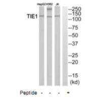 • Western blot analysis of extracts from HepG2 cells, K562 cells and Jurkat cells, using TIE1 antibody.
