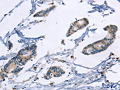 • The image on the left is immunohistochemistry of paraffin-embedded Human colon cancer tissue using CSB-PA268874(TLR8 Antibody) at dilution 1/40, on the right is treated with fusion protein. (Original magnification: ×200)