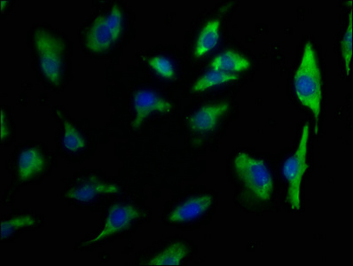 Immunofluorescence staining of U251 cells with CSB-PA012218NA01HU at 1:50, counter-stained with DAPI. The cells were fixed in 4% formaldehyde, permeabilized using 0.2% Triton X-100 and blocked in 10% normal Goat Serum. The cells were then incubated with the antibody overnight at 4°C. The secondary antibody was Alexa Fluor 488-congugated AffiniPure Goat Anti-Rabbit IgG(H+L).