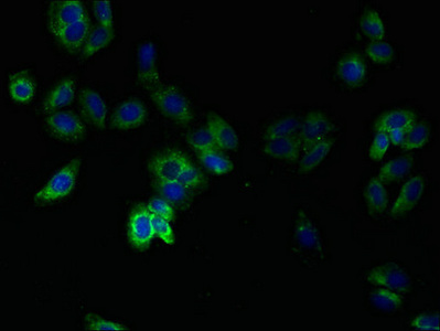 Immunofluorescent analysis of HepG2 cells using CSB-PA023721EA01HU at dilution of 1:100 and Alexa Fluor 488-congugated AffiniPure Goat Anti-Rabbit IgG(H+L)