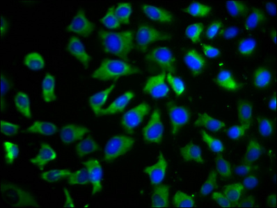 Immunofluorescence staining of A549 cells with CSB-PA023822LA01HU at 1:100, counter-stained with DAPI. The cells were fixed in 4% formaldehyde, permeabilized using 0.2% Triton X-100 and blocked in 10% normal Goat Serum. The cells were then incubated with the antibody overnight at 4°C. The secondary antibody was Alexa Fluor 488-congugated AffiniPure Goat Anti-Rabbit IgG(H+L).