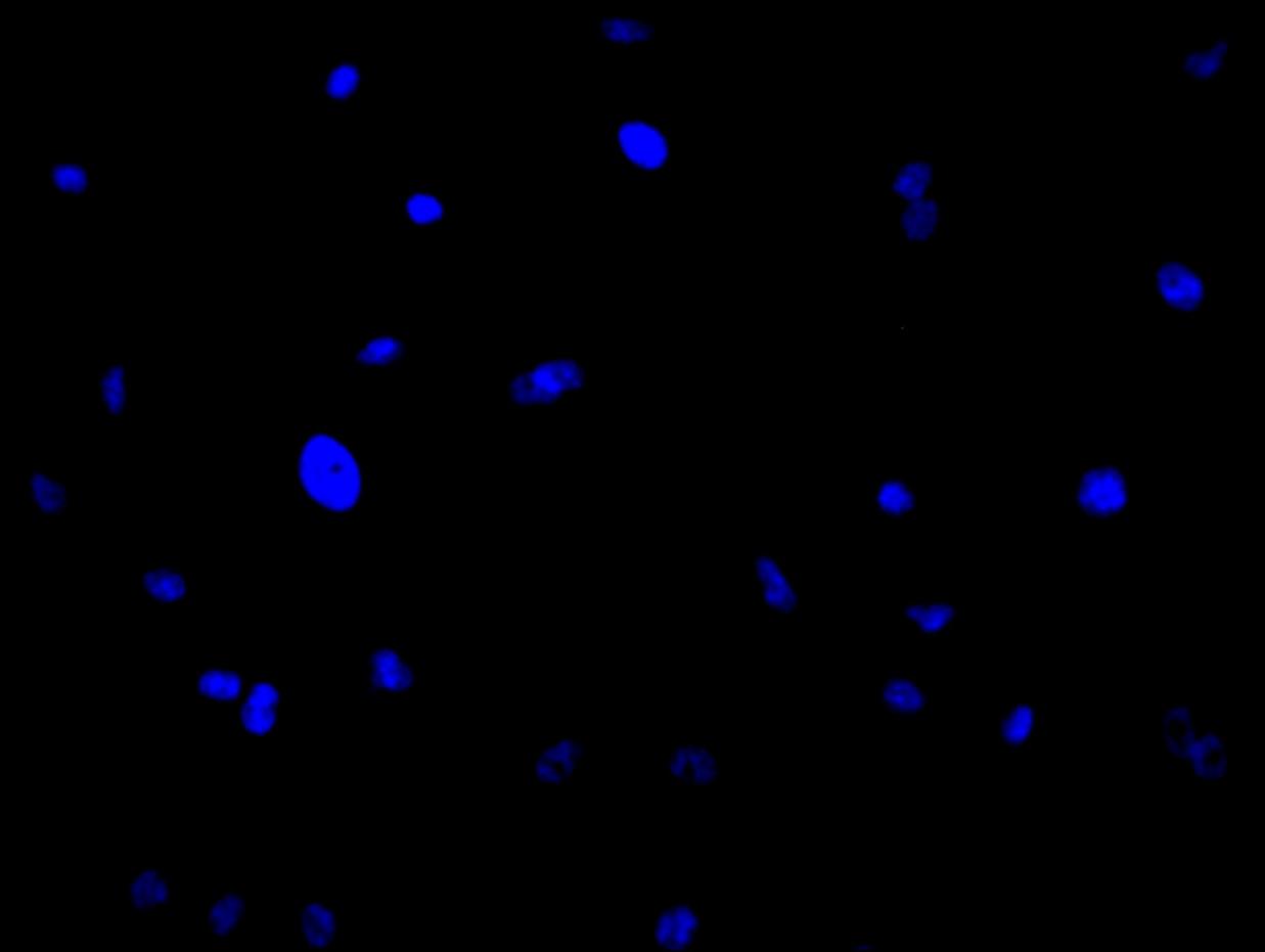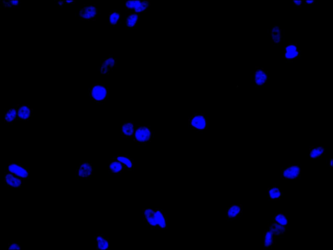 Immunofluorescence staining of A549 cell with 5% goat serum, counter-stained with DAPI. The cells were fixed in 4% formaldehyde and blocked in 10% normal Goat Serum. The cells were then incubated with the antibody overnight at 4C. The secondary antibody was Alexa Fluor 488-congugated AffiniPure Goat Anti-Rabbit IgG(H+L).