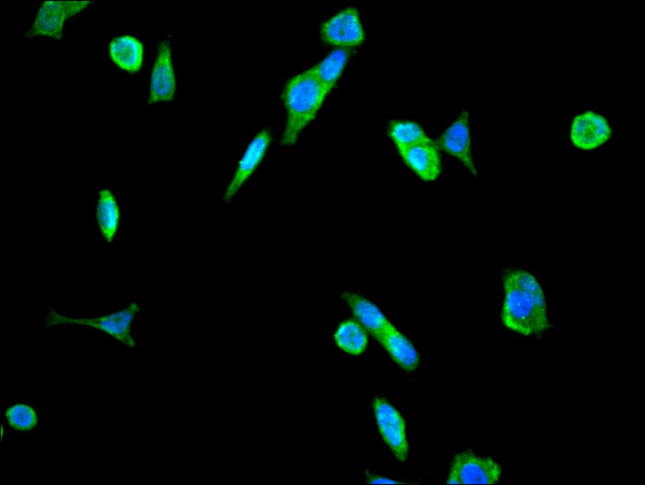 Immunofluorescence staining of MCF-7 cell with CSB-PA07889A0Rb at 1:30, counter-stained with DAPI. The cells were fixed in 4% formaldehyde and blocked in 10% normal Goat Serum. The cells were then incubated with the antibody overnight at 4C. The secondary antibody was Alexa Fluor 488-congugated AffiniPure Goat Anti-Rabbit IgG(H+L).