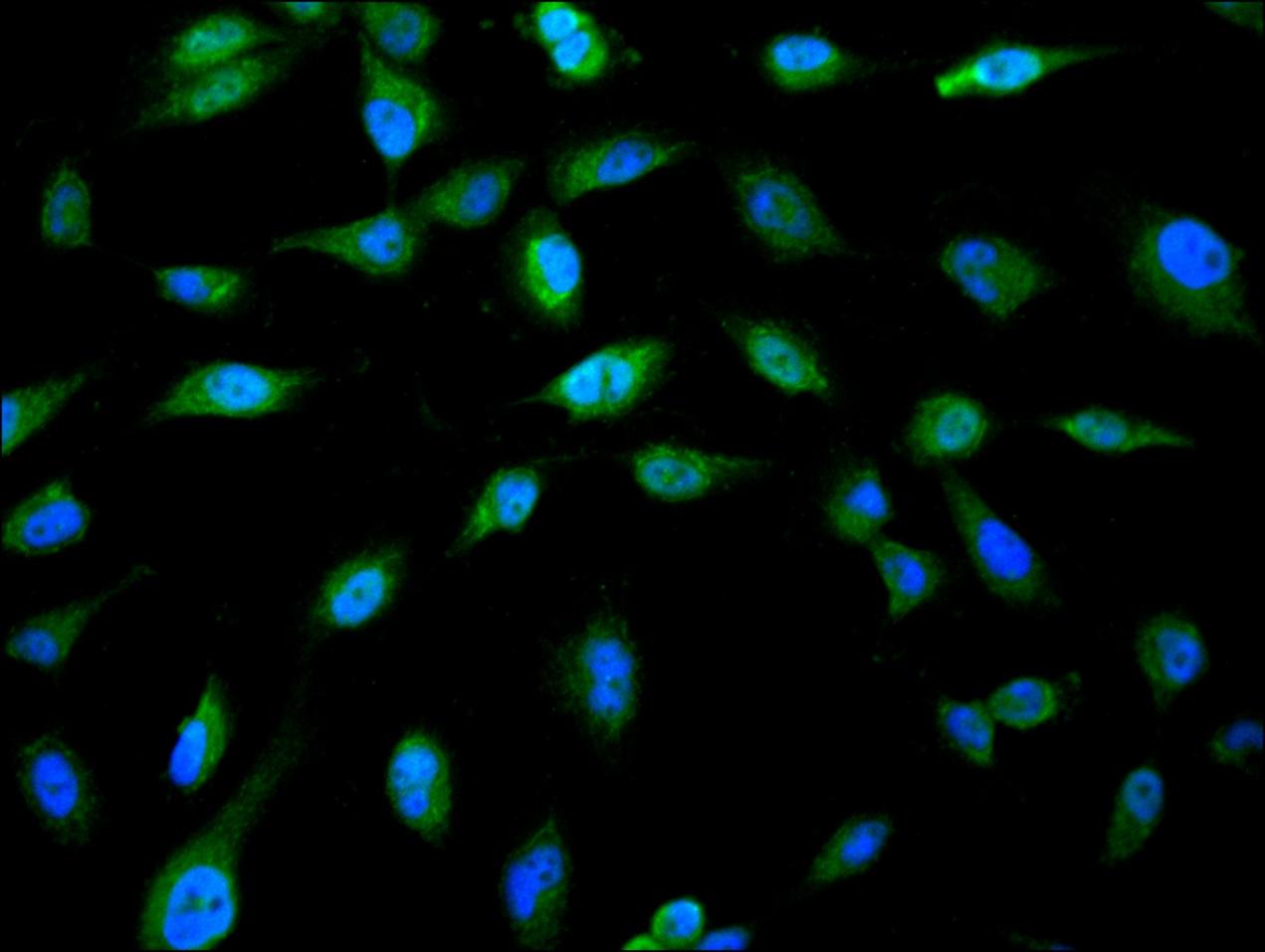 Immunofluorescence staining of U251 cell with CSB-PA07889A0Rb at 1:30, counter-stained with DAPI. The cells were fixed in 4% formaldehyde and blocked in 10% normal Goat Serum. The cells were then incubated with the antibody overnight at 4C. The secondary antibody was Alexa Fluor 488-congugated AffiniPure Goat Anti-Rabbit IgG(H+L).