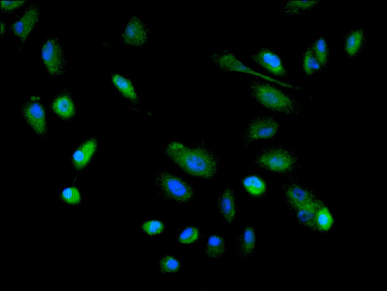 Immunofluorescence staining of A549 cell with CSB-PA07889A0Rb at 1:30, counter-stained with DAPI. The cells were fixed in 4% formaldehyde and blocked in 10% normal Goat Serum. The cells were then incubated with the antibody overnight at 4C. The secondary antibody was Alexa Fluor 488-congugated AffiniPure Goat Anti-Rabbit IgG(H+L).