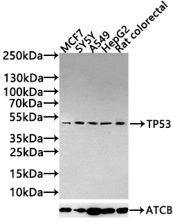 Positive WB detected in: MCF7 whole cell lysate(20μg), SY5Y whole cell lysate(20μg), A549 whole cell lysate(20μg), HepG2 whole cell lysate(20μg), Rat colorectal tissue lysate(20μg)