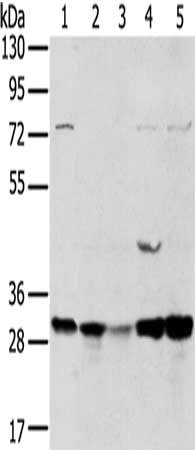 Gel: 8%SDS-PAGE, Lysate: 40 μg, Lane 1-5: 293T cells, MCF7 cells, mouse brain tissue, K562 cells, mouse bladder tissue, Primary antibody: CSB-PA291759(TPD52L2 Antibody) at dilution 1/400, Secondary antibody: Goat anti rabbit IgG at 1/8000 dilution, Exposure time: 20 seconds