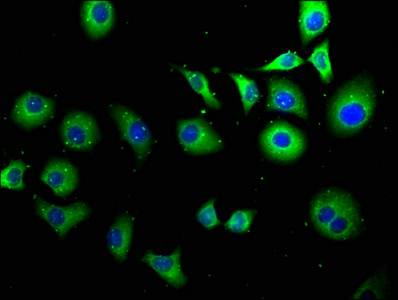 Immunofluorescence staining of A549 cells with CSB-PA884505LA01HU at 1:100, counter-stained with DAPI. The cells were fixed in 4% formaldehyde, permeabilized using 0.2% Triton X-100 and blocked in 10% normal Goat Serum. The cells were then incubated with the antibody overnight at 4°C. The secondary antibody was Alexa Fluor 488-congugated AffiniPure Goat Anti-Rabbit IgG(H+L).