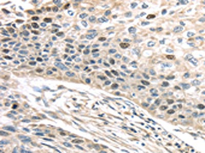 The image on the left is immunohistochemistry of paraffin-embedded Human esophagus cancer tissue using CSB-PA251071(TPX2 Antibody) at dilution 1/40, on the right is treated with fusion protein. (Original magnification: ×200)