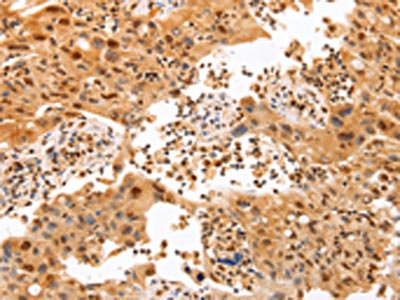 • The image on the left is immunohistochemistry of paraffin-embedded Human lung cancer tissue using CSB-PA069375(TRAF5 Antibody) at dilution 1/20, on the right is treated with fusion protein. (Original magnification: ×200)
