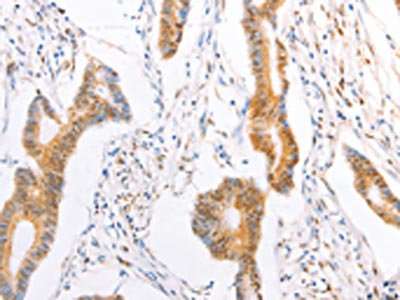 • The image on the left is immunohistochemistry of paraffin-embedded Human colon cancer tissue using CSB-PA069375(TRAF5 Antibody) at dilution 1/20, on the right is treated with fusion protein. (Original magnification: ×200)