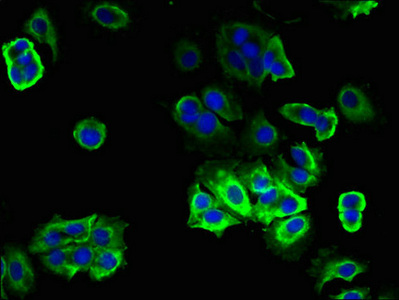 • Immunofluorescent analysis of MCF-7 cells using CSB-PA624011LA01HU at dilution of 1:100 and Alexa Fluor 488-congugated AffiniPure Goat Anti-Rabbit IgG(H+L)