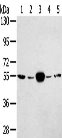 Gel: 8%SDS-PAGE, Lysate: 40 μg, Lane 1-5: Hela cells, K562 cells, human fetal muscle tissue, A375 cells, hepg2 cells, Primary antibody: CSB-PA434464(TRIM35 Antibody) at dilution 1/400, Secondary antibody: Goat anti rabbit IgG at 1/8000 dilution, Exposure time: 20 seconds