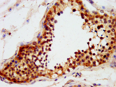 IHC image of CSB-PA652403LA01HU diluted at 1:600 and staining in paraffin-embedded human testis tissue performed on a Leica BondTM system. After dewaxing and hydration, antigen retrieval was mediated by high pressure in a citrate buffer (pH 6.0). Section was blocked with 10% normal goat serum 30min at RT. Then primary antibody (1% BSA) was incubated at 4°C overnight. The primary is detected by a biotinylated secondary antibody and visualized using an HRP conjugated SP system.