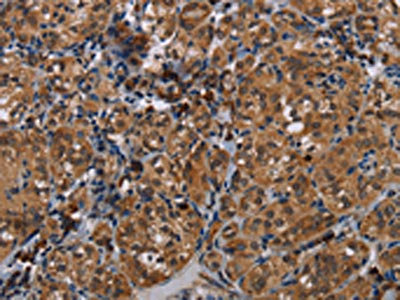 • The image on the left is immunohistochemistry of paraffin-embedded Human thyroid cancer tissue using CSB-PA216653(TRPV1 Antibody) at dilution 1/20, on the right is treated with synthetic peptide. (Original magnification: ×200)