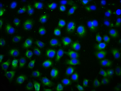 Immunofluorescence staining of A549 cells with CSB-PA025149LA01HU at 1:133, counter-stained with DAPI. The cells were fixed in 4% formaldehyde, permeabilized using 0.2% Triton X-100 and blocked in 10% normal Goat Serum. The cells were then incubated with the antibody overnight at 4°C. The secondary antibody was Alexa Fluor 488-congugated AffiniPure Goat Anti-Rabbit IgG(H+L).