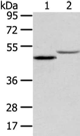 Gel: 8%SDS-PAGE, Lysate: 40 μg, Lane 1-2: Mouse adrenal gland and kidney tissue, Primary antibody: CSB-PA100188(TTC23 Antibody) at dilution 1/400 dilution, Secondary antibody: Goat anti rabbit IgG at 1/8000 dilution, Exposure time: 20 seconds