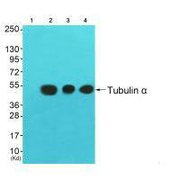 Western blot analysis of extracts from 3T3 cells (Lane 2), colo cells (Lane 3) and HuvEc cells (Lane 4), using Tubulin α antiobdy. The lane on the left is treated with synthesized peptide.
