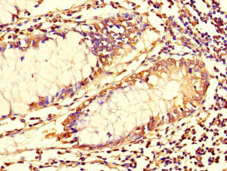 Immunohistochemistry of paraffin-embedded human colon cancer using CSB-PA025334LA01HU at dilution of 1:100