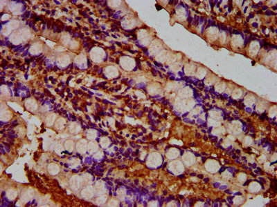 IHC image of CSB-PA025352LA01HU diluted at 1:300 and staining in paraffin-embedded human small intestine tissue performed on a Leica BondTM system. After dewaxing and hydration, antigen retrieval was mediated by high pressure in a citrate buffer (pH 6.0). Section was blocked with 10% normal goat serum 30min at RT. Then primary antibody (1% BSA) was incubated at 4°C overnight. The primary is detected by a biotinylated secondary antibody and visualized using an HRP conjugated SP system.