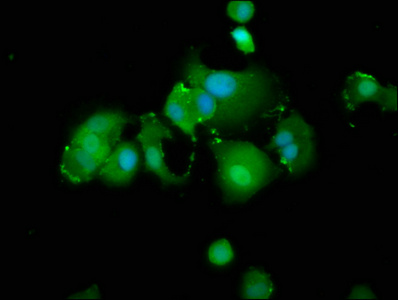 Immunofluorescence staining of MCF-7 cells with CSB-PA880966LA01HU at 1:166, counter-stained with DAPI. The cells were fixed in 4% formaldehyde, permeabilized using 0.2% Triton X-100 and blocked in 10% normal Goat Serum. The cells were then incubated with the antibody overnight at 4°C. The secondary antibody was Alexa Fluor 488-congugated AffiniPure Goat Anti-Rabbit IgG(H+L).
