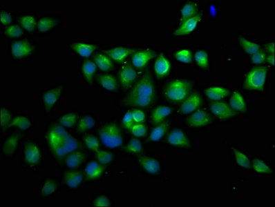 • Immunofluorescence staining of Hela cells with CSB-PA00149A0Rb at 1:66, counter-stained with DAPI. The cells were fixed in 4% formaldehyde, permeabilized using 0.2% Triton X-100 and blocked in 10% normal Goat Serum. The cells were then incubated with the antibody overnight at 4°C. The secondary antibody was Alexa Fluor 488-congugated AffiniPure Goat Anti-Rabbit IgG(H+L).