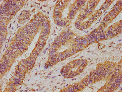 IHC image of CSB-PA025555EA01HU diluted at 1:50 and staining in paraffin-embedded human colon cancer performed on a Leica BondTM system. After dewaxing and hydration, antigen retrieval was mediated by high pressure in a citrate buffer (pH 6.0). Section was blocked with 10% normal goat serum 30min at RT. Then primary antibody (1% BSA) was incubated at 4°C overnight. The primary is detected by a biotinylated secondary antibody and visualized using an HRP conjugated SP system.