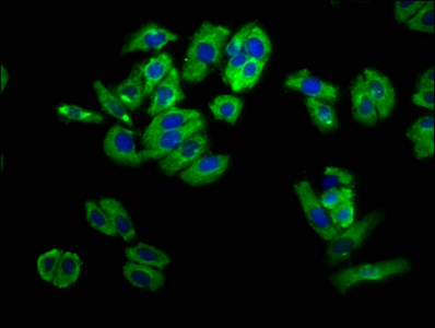 Immunofluorescence staining of HepG2 cells with CSB-PA025629LA01HU at 1:100, counter-stained with DAPI. The cells were fixed in 4% formaldehyde, permeabilized using 0.2% Triton X-100 and blocked in 10% normal Goat Serum. The cells were then incubated with the antibody overnight at 4°C. The secondary antibody was Alexa Fluor 488-congugated AffiniPure Goat Anti-Rabbit IgG(H+L).