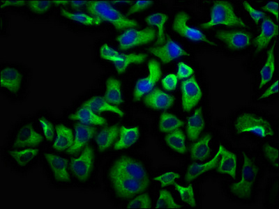 Immunofluorescence staining of Hela cells with CSB-PA740925LA01HU at 1:100, counter-stained with DAPI. The cells were fixed in 4% formaldehyde, permeabilized using 0.2% Triton X-100 and blocked in 10% normal Goat Serum. The cells were then incubated with the antibody overnight at 4°C. The secondary antibody was Alexa Fluor 488-congugated AffiniPure Goat Anti-Rabbit IgG(H+L).