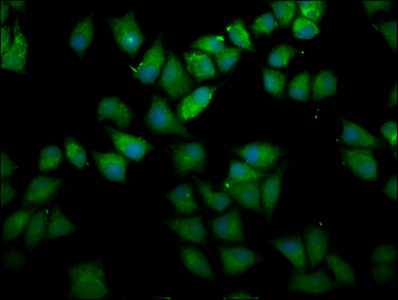 • Immunofluorescence staining of Hela cells with CSB-PA883646LA01HU at 1:166, counter-stained with DAPI. The cells were fixed in 4% formaldehyde, permeabilized using 0.2% Triton X-100 and blocked in 10% normal Goat Serum. The cells were then incubated with the antibody overnight at 4°C. The secondary antibody was Alexa Fluor 488-congugated AffiniPure Goat Anti-Rabbit IgG(H+L).